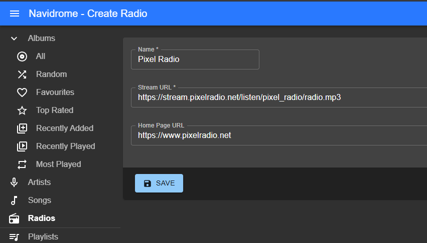 4. Click "Save". You will then see Pixel Radio has been added to Navidrome. Click it to start listening :)